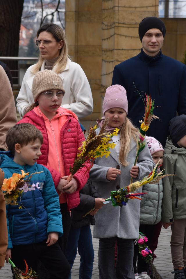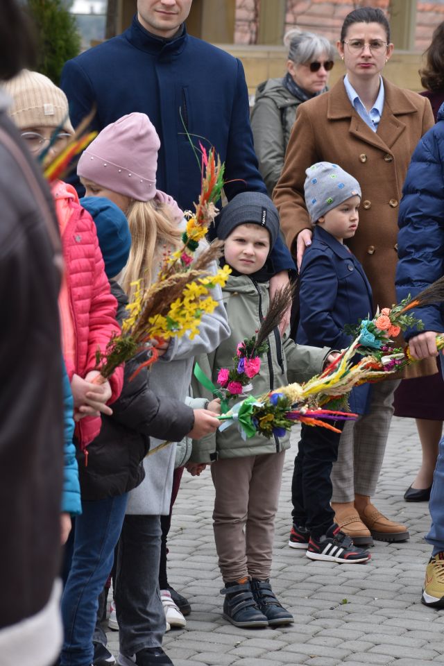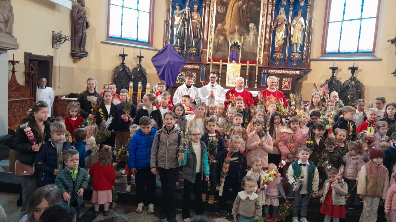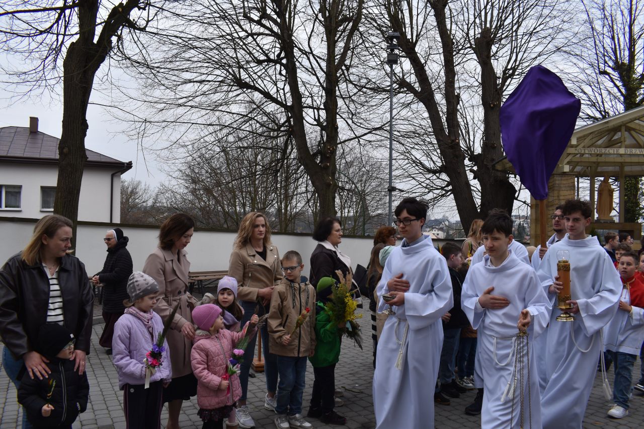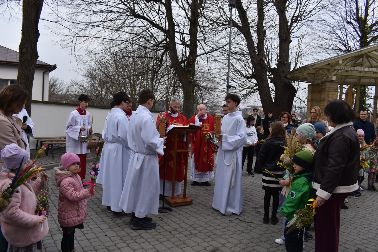 29 marca 2026 roku, tydzień przed Wielkanocą, przypadała Niedziela Palmowa. Mszę Świętą o godz. 11.00 rozpoczęliśmy przed ołtarzem polowym, gdzie miał miejsce obrzęd poświęcenia palm. W czasie Eucharystii wysłuchaliśmy opisu Męki Pańskiej wg św. Mateusza.