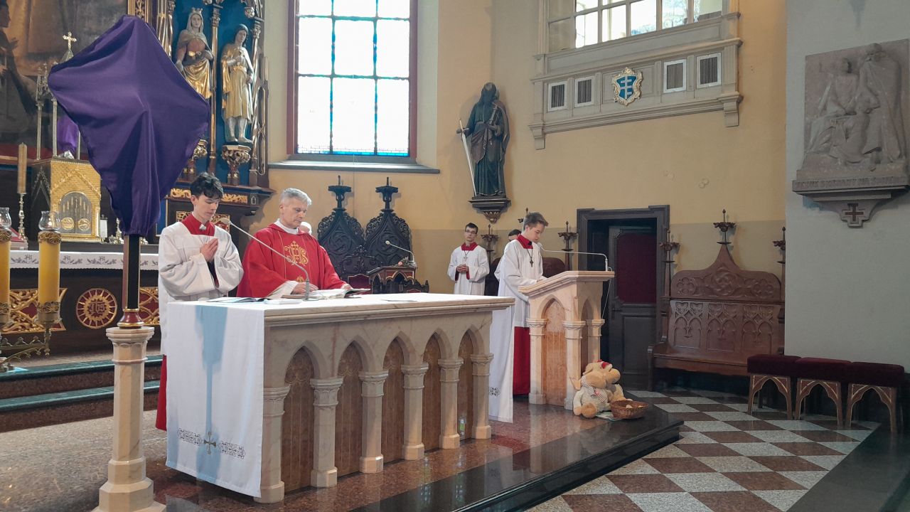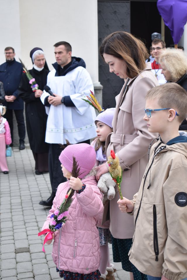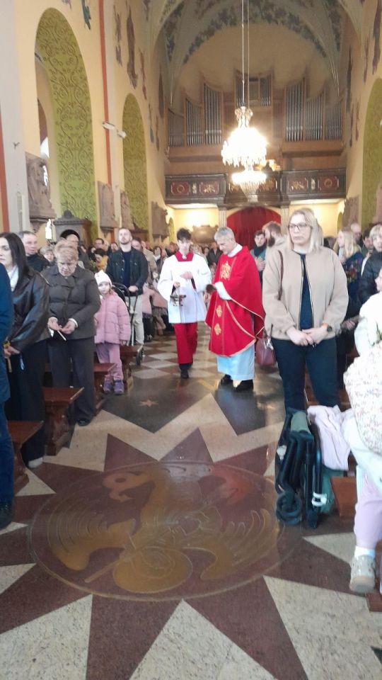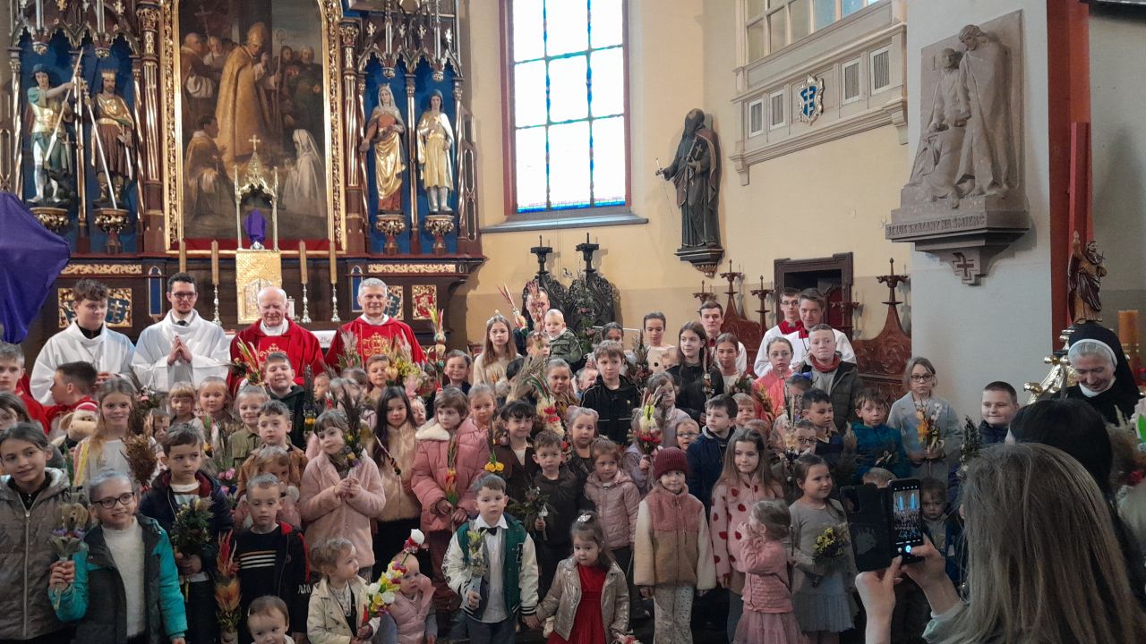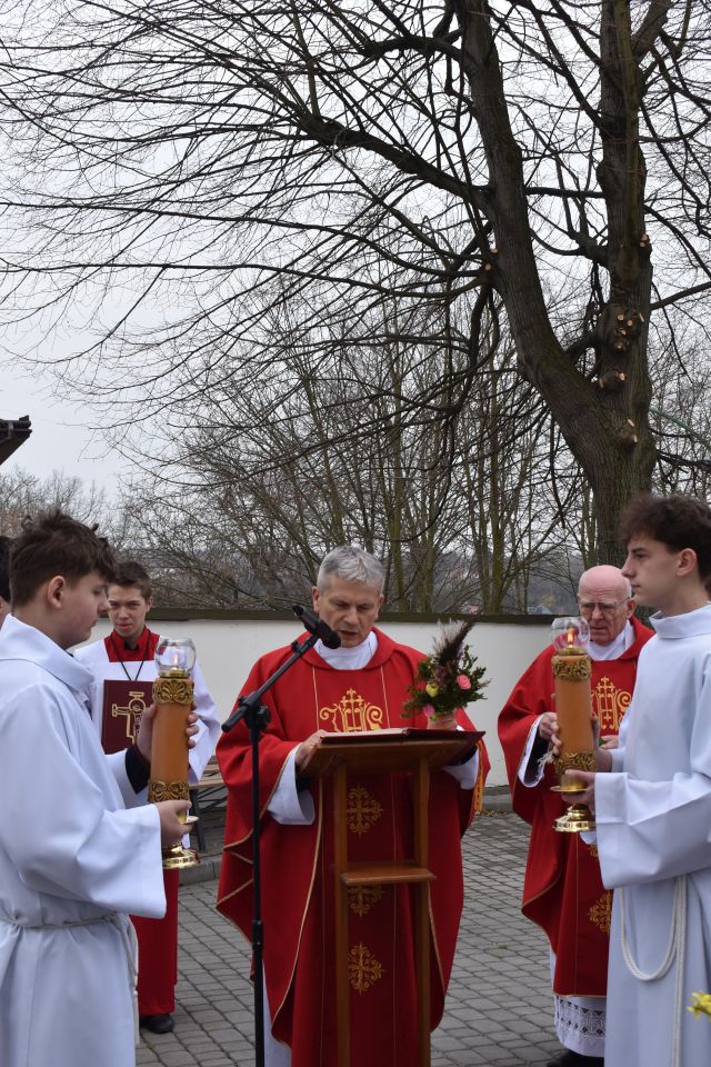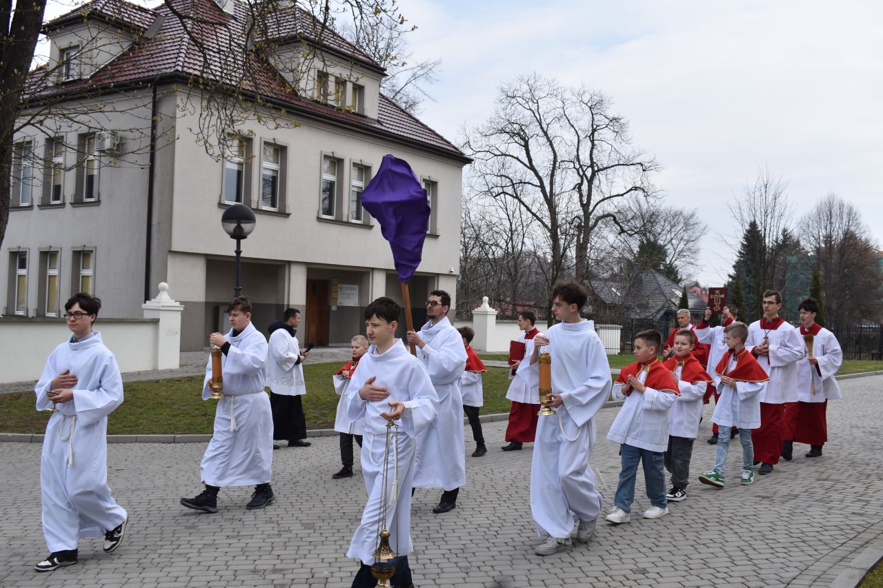 29 marca 2026 roku, tydzień przed Wielkanocą, przypadała Niedziela Palmowa. Mszę Świętą o godz. 11.00 rozpoczęliśmy przed ołtarzem polowym, gdzie miał miejsce obrzęd poświęcenia palm. W czasie Eucharystii wysłuchaliśmy opisu Męki Pańskiej wg św. Mateusza.